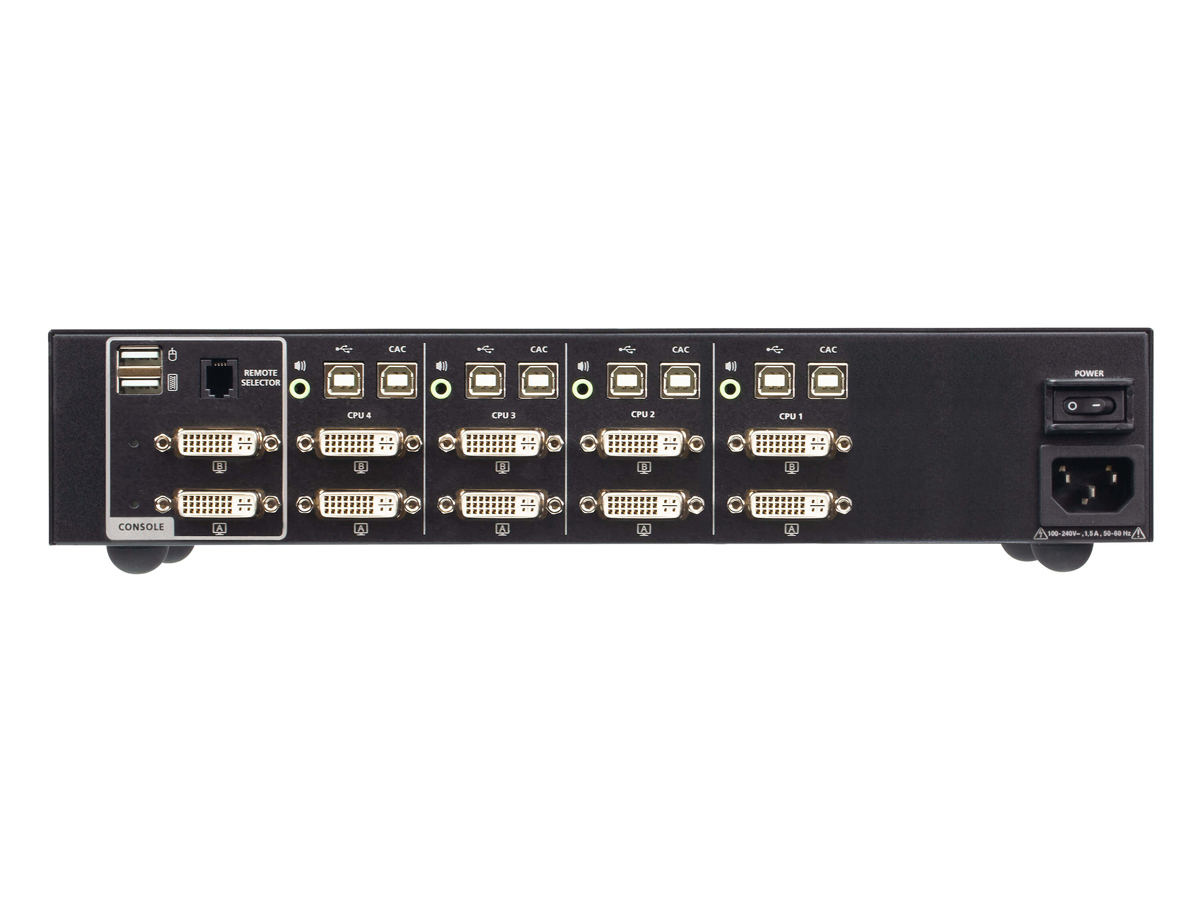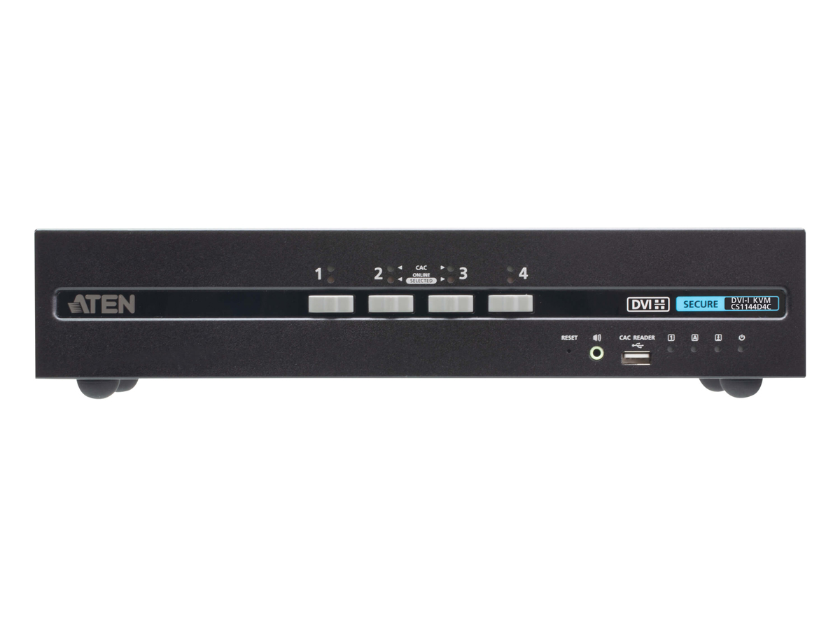 The CS1144D4C is a secure 4-port USB DVI dual-display KVM switch designed to share a keyboard, mouse, dual DVI displays, speaker output and a Common Access Card reader across multiple isolated computer sources. It enforces strict peripheral and data isolation to prevent unauthorized data flow when switching between systems. The unit is PSD PP v4.0 compliant and built to meet rigorous security requirements used in classified environments.