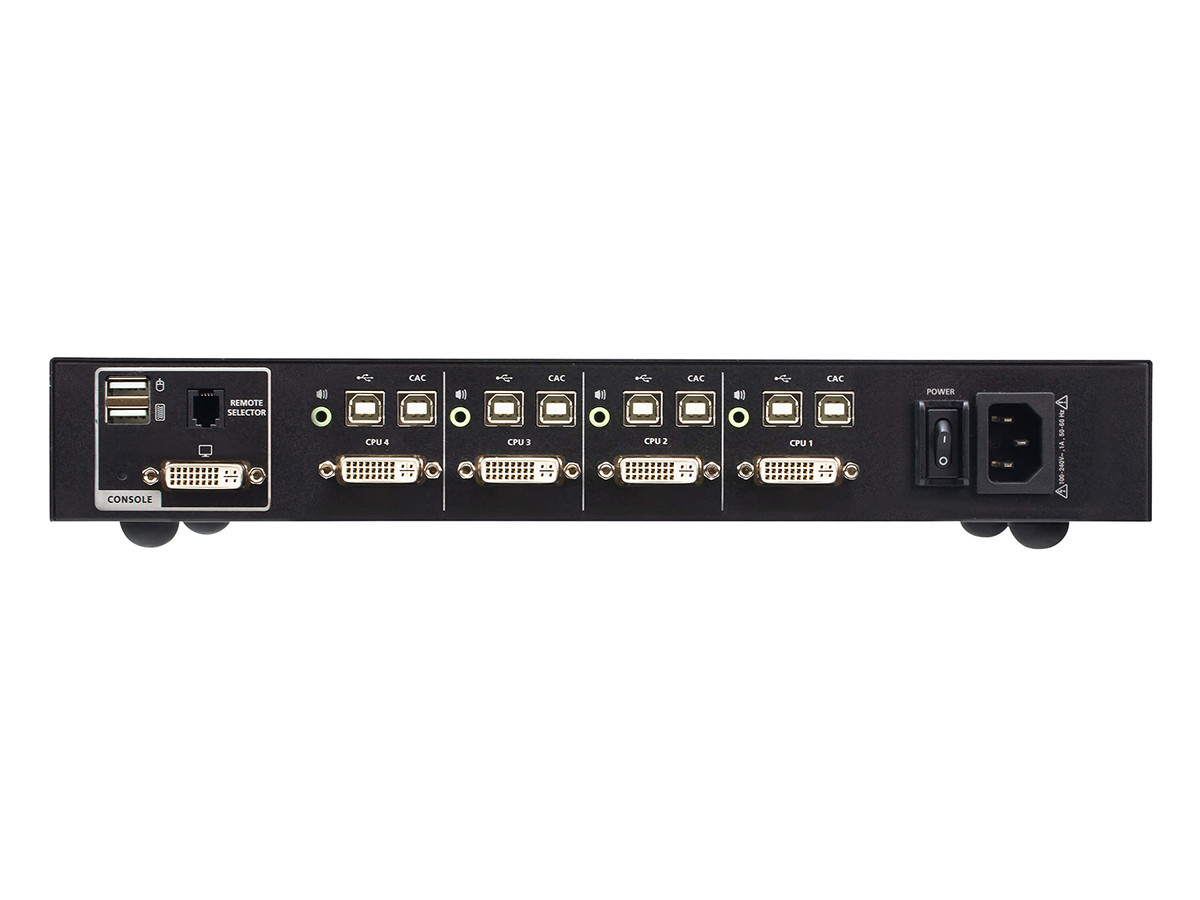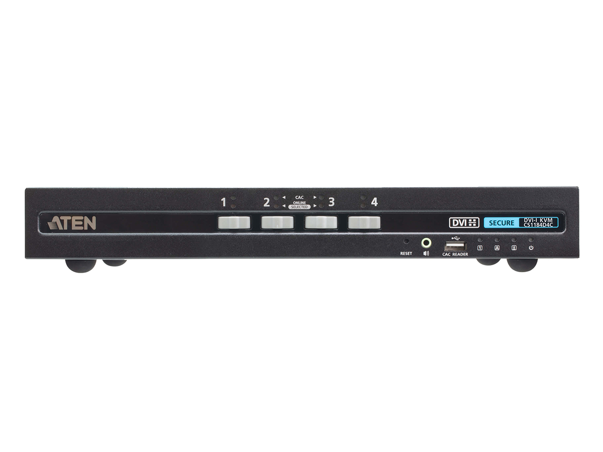 The CS1184D4C is a secure 4-port USB DVI KVM switcher designed to isolate and share a single keyboard, mouse, monitor and speaker set between multiple classified systems. It provides hardware-enforced security features compliant with PSD PP v4.0 and certified by NIAP. The unit is TAA eligible and built for environments that require strict data separation and tamper protection.