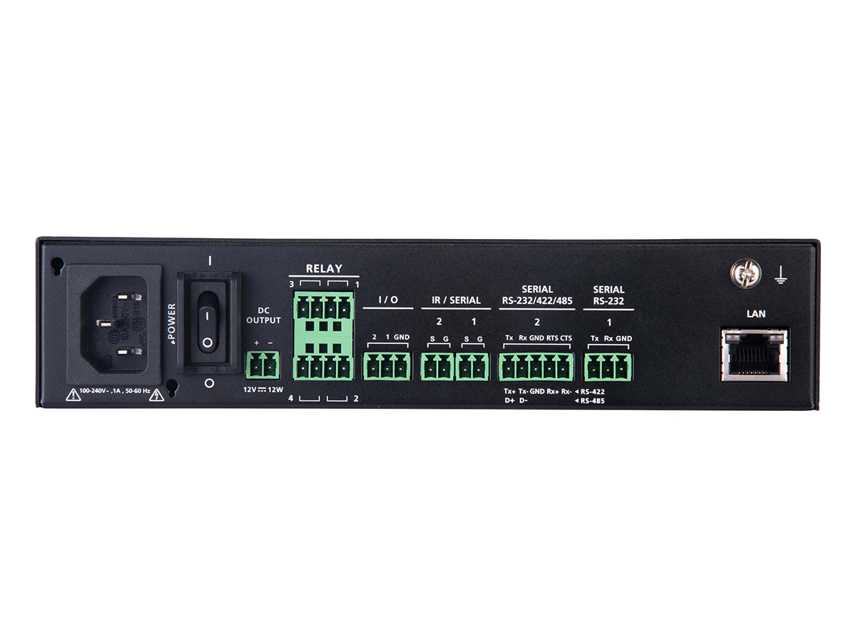 Installation is straightforward with a compact metal housing, LED status indicators, a single 12 VDC output, and standard terminal block connectors for serial, IR, relay, and I/O wiring. A Web GUI and USB project upload simplify commissioning and firmware updates, while the device operates across a wide ambient range and low power consumption. Rugged construction and secure protocol support make it practical for long-term, managed AV/IT installations.