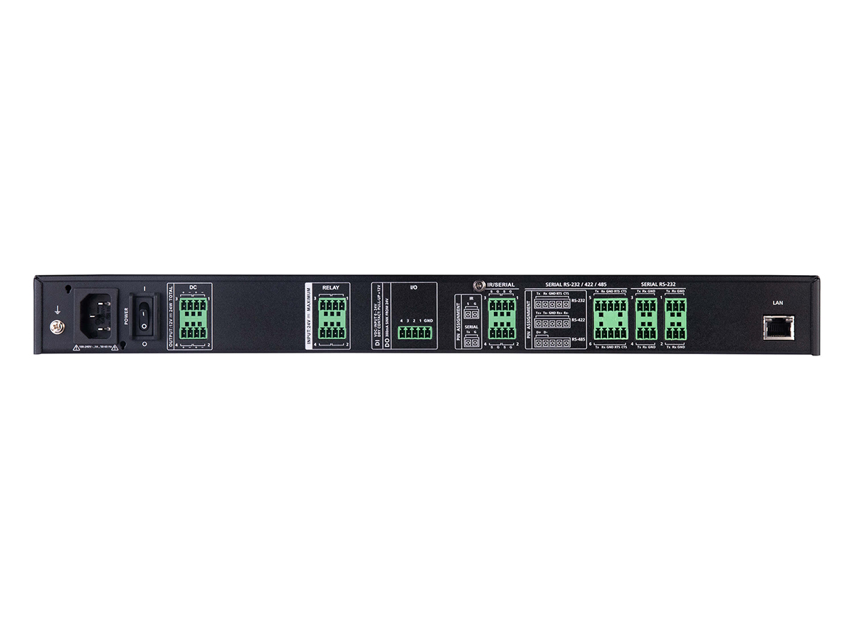 Connectivity options are extensive – programmable bi-directional RS-232/422/485 ports, additional RS-232 ports, IR/serial programmable ports, relay channels, digital I/O, 12 VDC output ports and a USB Type-A port. Network support includes DHCP, static addressing and a default IP fallback. The VK2100A is compatible with a wide range of AV, lighting, HVAC and facility devices.