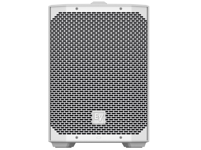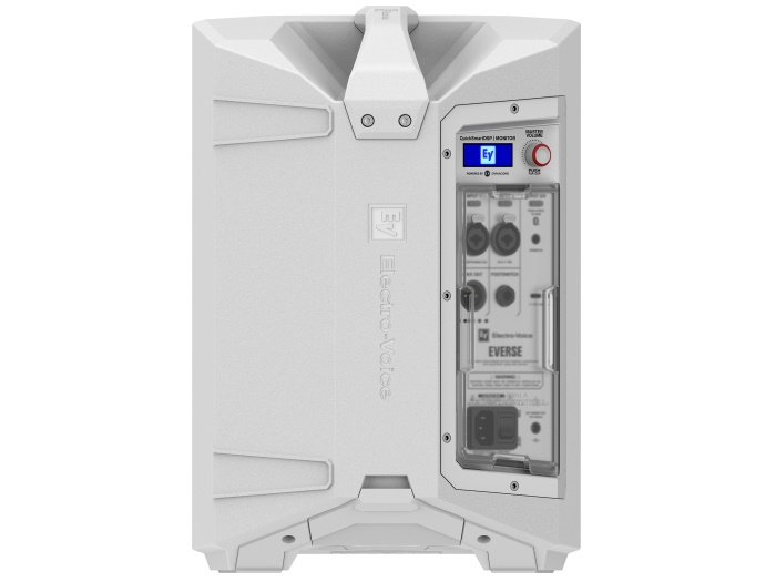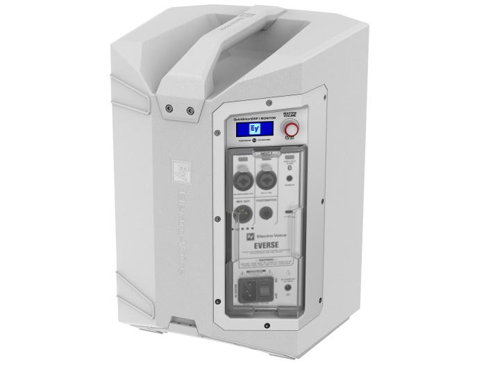 The EVERSE 8 features Electro-Voice’s QuickSmart DSP and is POWERED BY DYNACORD, featuring a built-in 4- channel digital mixer with FX (footswitch controlled), feedback suppression, and ducking features. The loudspeaker features a custom designed, and fully optimized for audio use, high capacity battery pack. The battery pack provides more than enough power to complete the show, including a 12 V DC accessory port to power RE3 or R300 wireless microphone systems. The EVERSE 8 is available in both white and black.
