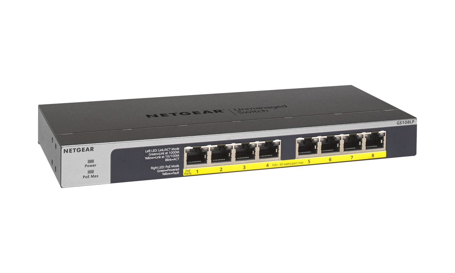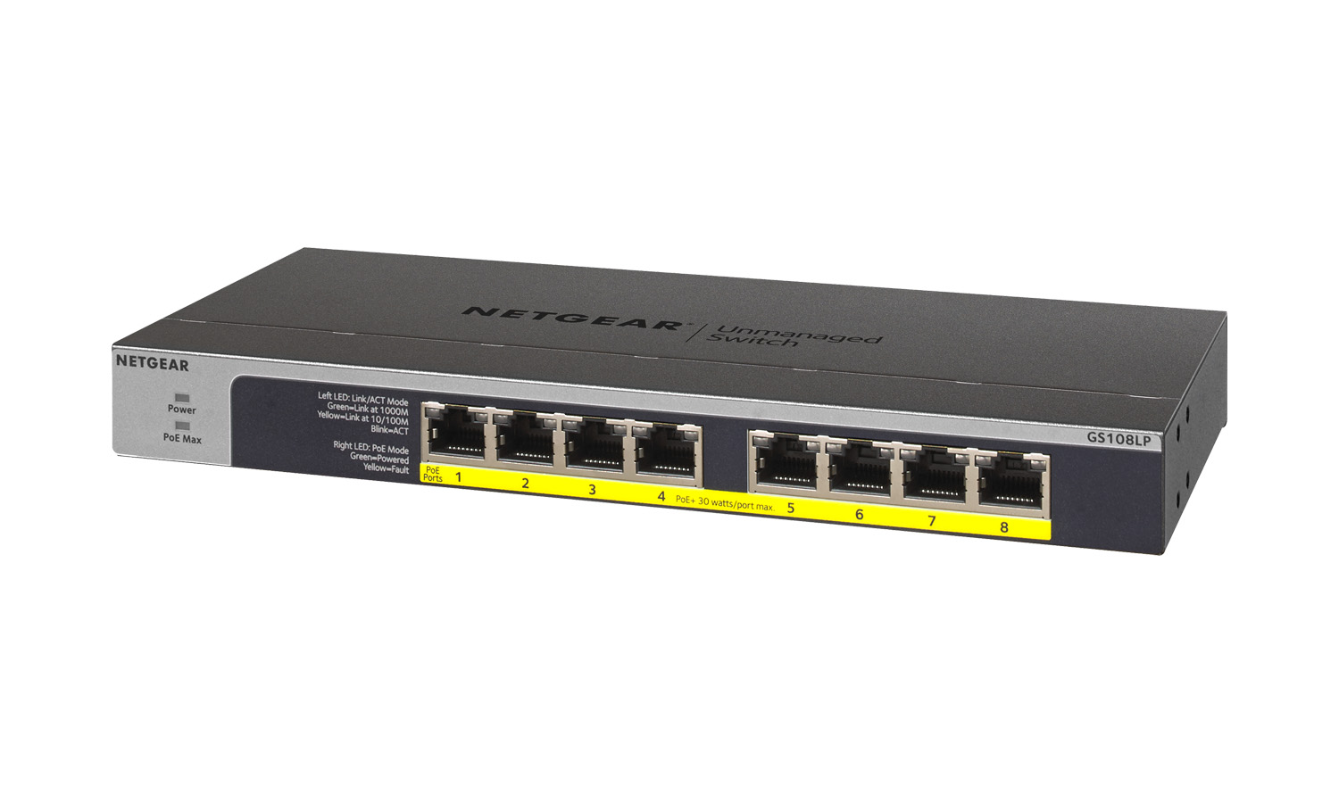 8 PoE+ ports with 60W total power budget, and includes NETGEAR FlexPoE making it expandable to 90W or even 130W (w/separately purchased power supply modules).