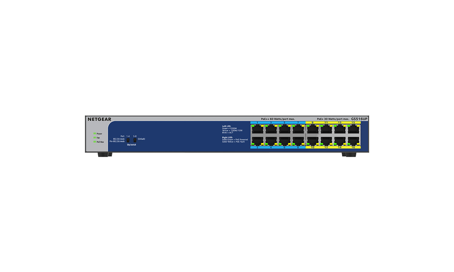 NETGEAR brings even larger PoE budgets on Unmanaged switches with Ultra60 PoE++ technology with new 16- Port (NET-6RU905) Unmanaged Switch, ideal for powerful PoE+/PoE++ installations with impressive PoE budgets up to 380W, a compact size, plug-and-play installation, and reliable performance at affordable prices.
