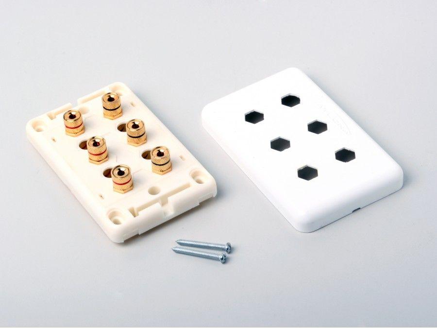 Speaker Wall Plate with 6 Binding posts. This wall plate is designed for any installation that requires running wires in the walls. The wire can be secured to the wall plate by using banana plugs, spade connectors or simply by using binding posts that are already attached to the wall plate.