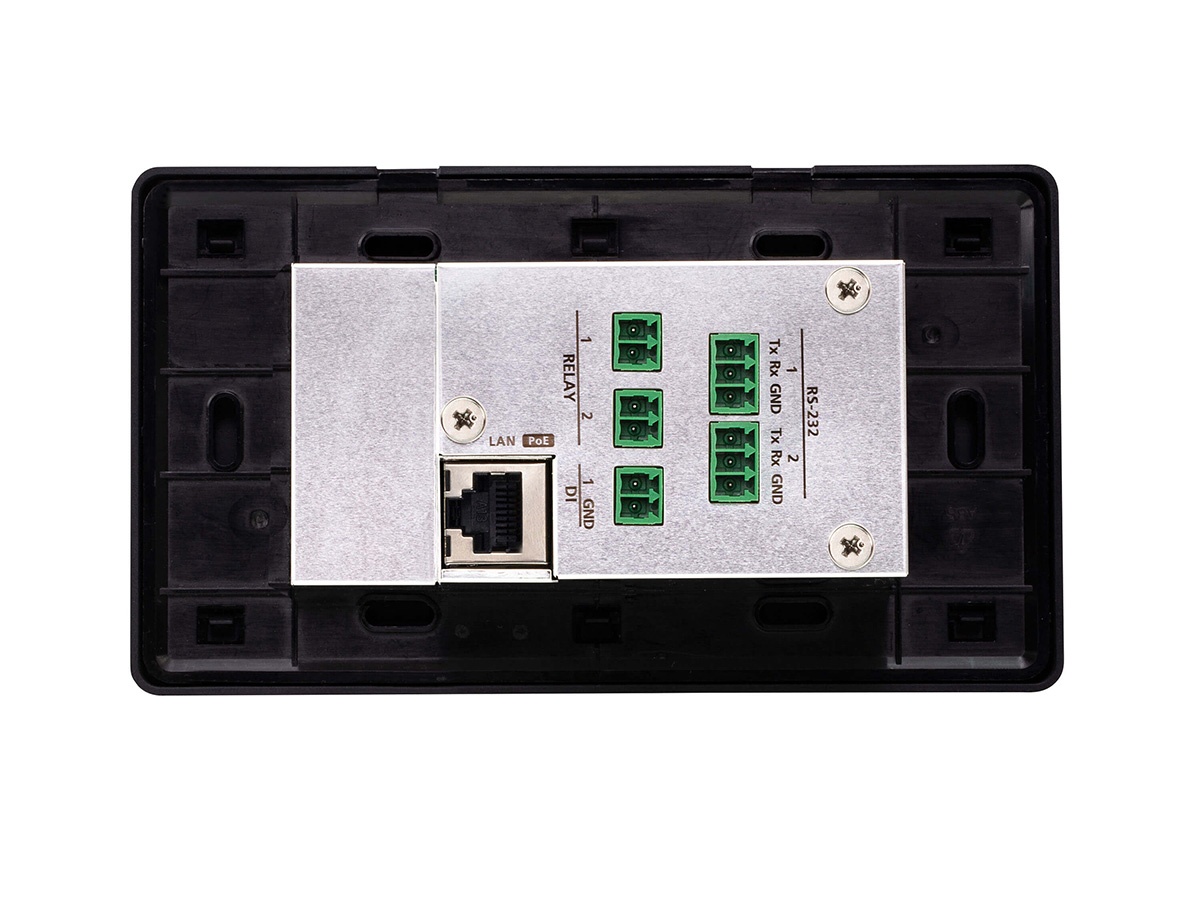 The control pad offers a modular keypad layout that supports 6 to 12 buttons and 125 possible combinations. It includes multiple hardware interfaces – 2 RS-232 ports, 2 relay channels, one digital input and one Ethernet port – enabling direct device control without additional converters. Dual power options including Power over Ethernet (PoE) and optional DC 5V help ensure continuous operation in varied installations.