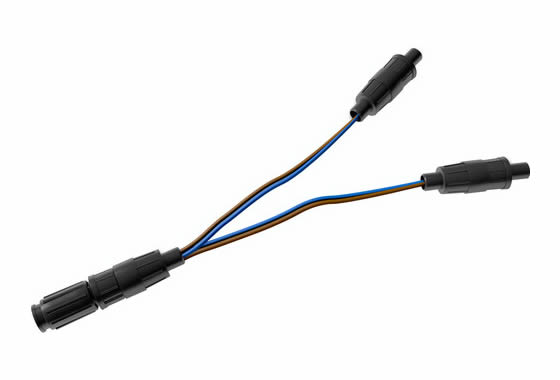 The FiDO Power Y-Cable for DRM2 3 RU Rackmount Frame from AJA enables you to support two FiDO Mini-Converters in the DRM2 3 RU frame. This Y-shaped cable has a DC power input connector on one end and two DC output connectors on the other.