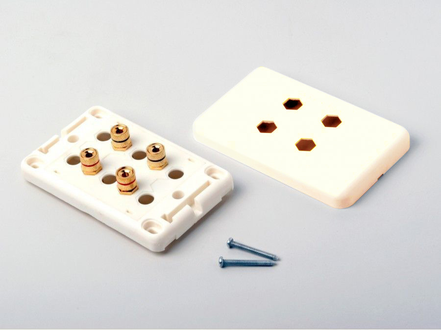 Speaker Wall Plate with 4 Binding posts. This wall plate is designed for any installation that requires running wires in the walls. The wire can be secured to the wall plate by using banana plugs, spade connectors or simply by using binding posts that are already attached to the wall plate.