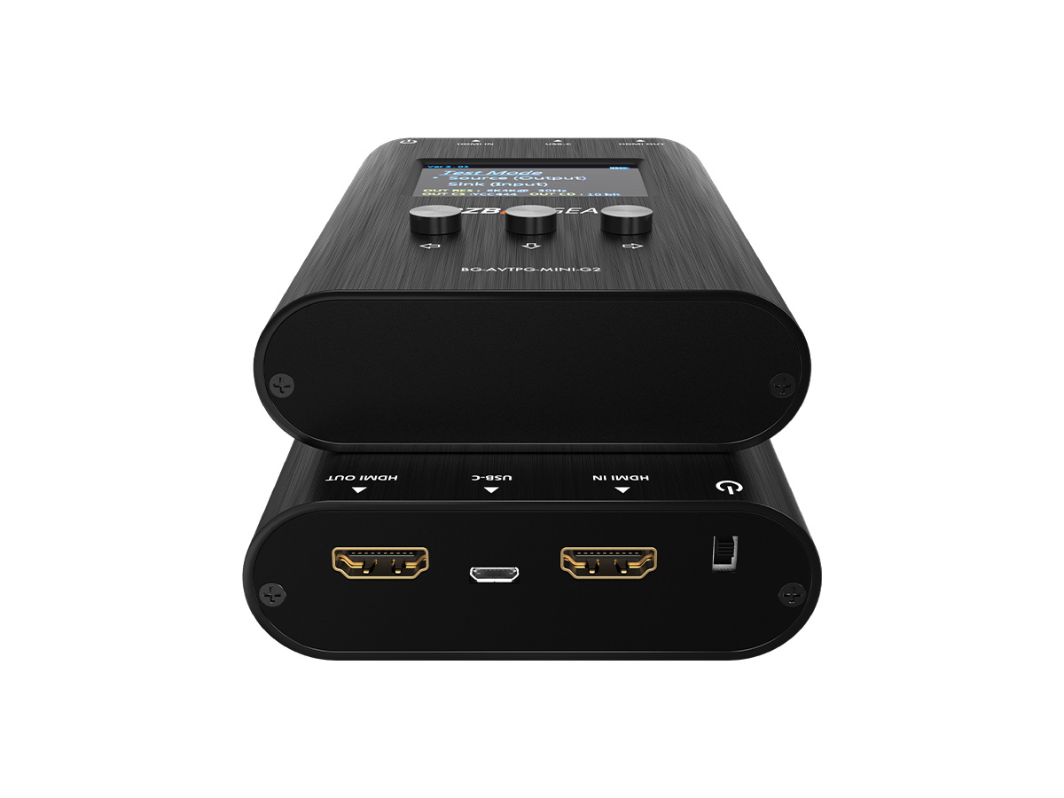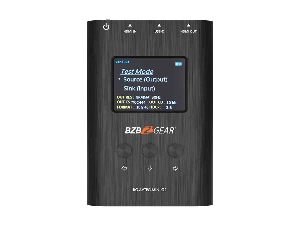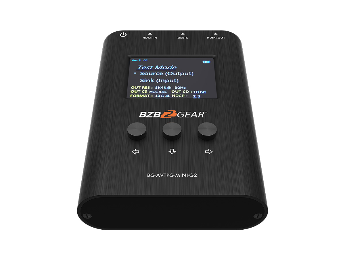 The BG-AVTPG-MINI-G2 HDMI 2.1 tester/analyzer is a mobile, hand-held device which can help installers test cable quality by generating HDMI signals and detecting important HDMI features quickly. With this handy and portable tool users will appreciate the built-in 3 hour chargeable battery, video patterns and other features. It features adjustable color depth so installers can instantly test the connected display’s capability. Getting important pieces of information makes troubleshooting a breeze and helps installers take the guess work out of HDMI compatibility issues. With the device’s response time, you will have the answer to a potential problem in less than a minute! The BG-AVTPG-MINI-G2, with its cost and features, is the ideal testing unit for custom and commercial integrators to have on every call!