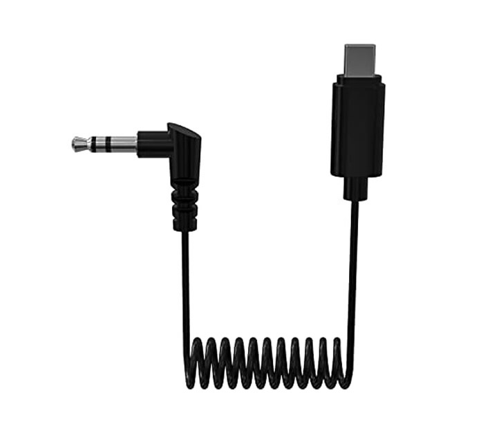 The cable includes a male right-angle 3.5mm TRS connector and a male USB-C connector. The coiled design reduces slack on set and stretches when additional length is required. This format keeps the cable compact when not under tension and reduces strain on connectors.