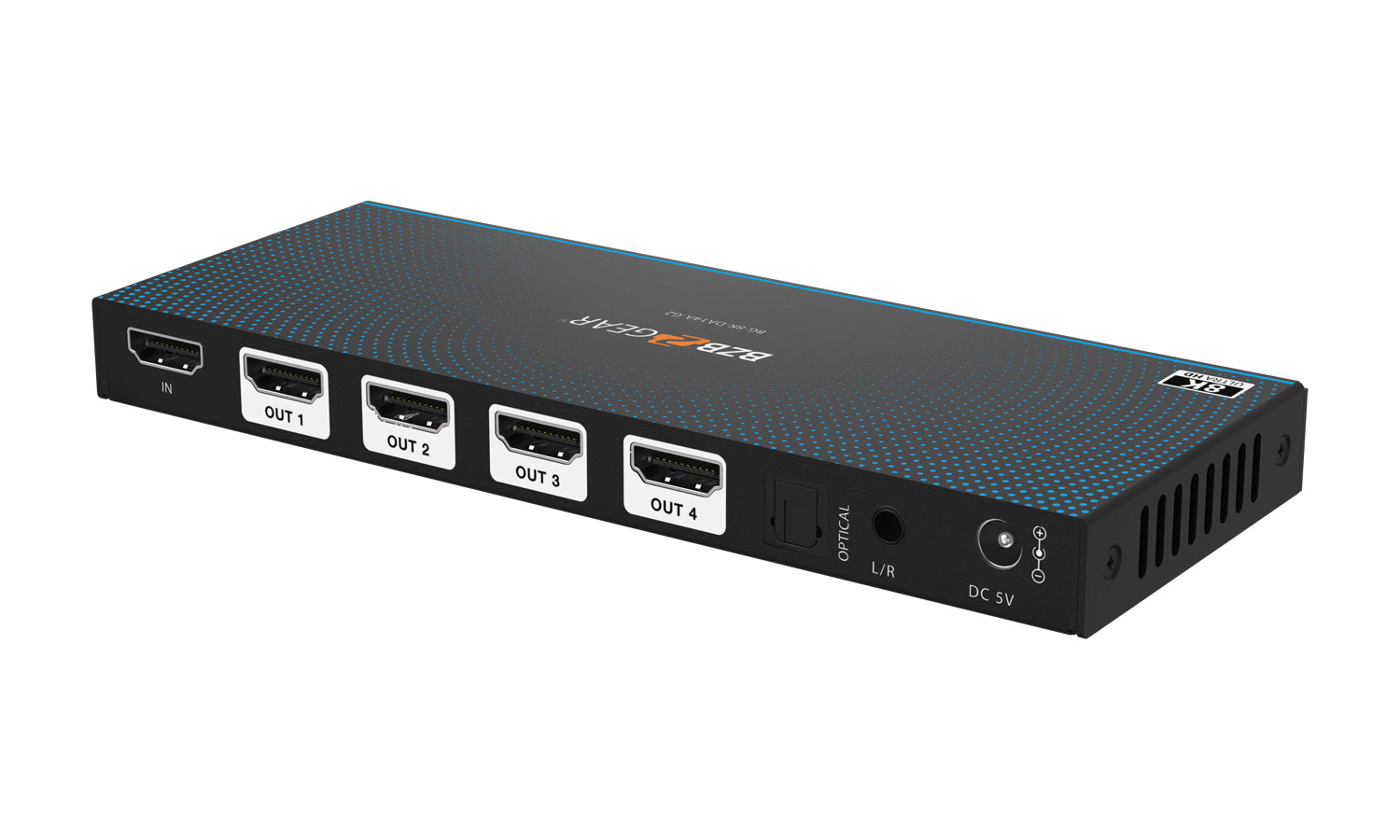 The BG-8K-DA14A-G2 is a high-performance 1×4 HDMI 2.1 splitter designed to distribute a single 8K HDMI source to up to four display devices simultaneously. Supporting cutting-edge 8K@60Hz and 4K@120Hz resolutions, this splitter ensures crystal-clear visuals with HDR10+, Dolby Vision, and HLG for a truly immersive viewing experience. With a robust 48 Gbps FRL bandwidth, HDCP 2.3 compliance, and advanced gaming features like VRR and ALLM, this device is perfect for home theaters, gaming setups, and professional AV environments. Additionally, its built-in audio de-embedding capability allows seamless extraction of audio through optical S/PDIF and analog L/R outputs, offering enhanced flexibility for integrating external sound systems.