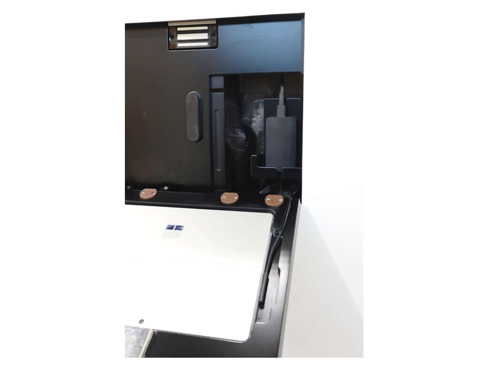 Connectivity and compatibility are centered on tablet integration – the adapter is designed for use with Microsoft Surface Go 2 and compatible USB-C travel hubs by Microsoft. The unit ships with a USB-C 90° adapter to facilitate cable routing and a Wall-Smart key for lock operation. Tablet and hub are not included and must be supplied separately by the installer.