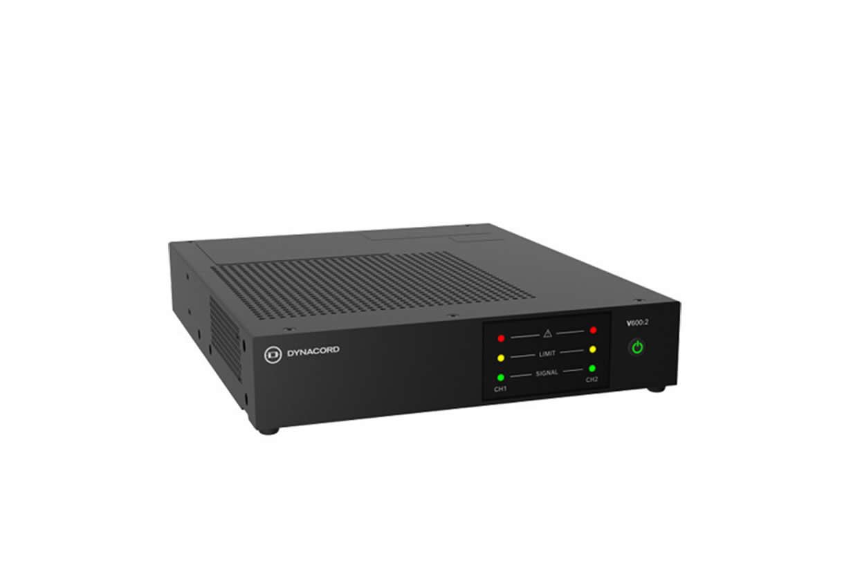 The Dynacord V600:2 is a compact 2-channel power amplifier delivering a total PowerTANK capacity of 600 W. It combines a Class D output stage with professional power supply and protection features to support distributed audio systems. The design focuses on clear voice reproduction and reliable background music reproduction in commercial environments.