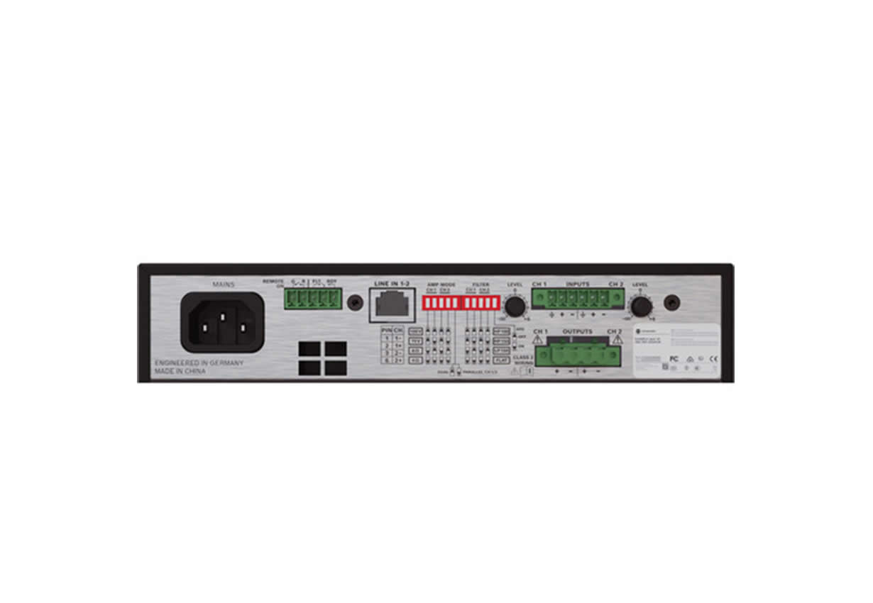 PowerTANK technology provides a shared reservoir of amplification power that dynamically allocates energy across both channels. Variable Load Drive (VLD) ensures consistent power delivery into 4 Ohm, 8 Ohm, 70 V and 100 V loads. Energy-saving features EcoRAIL and Auto Power Down reduce consumption during low-level operation or extended idle periods.