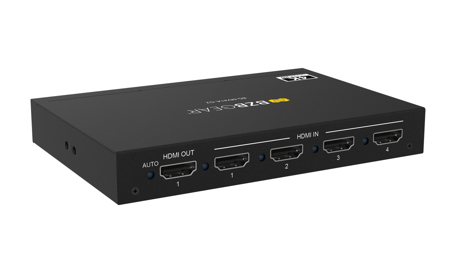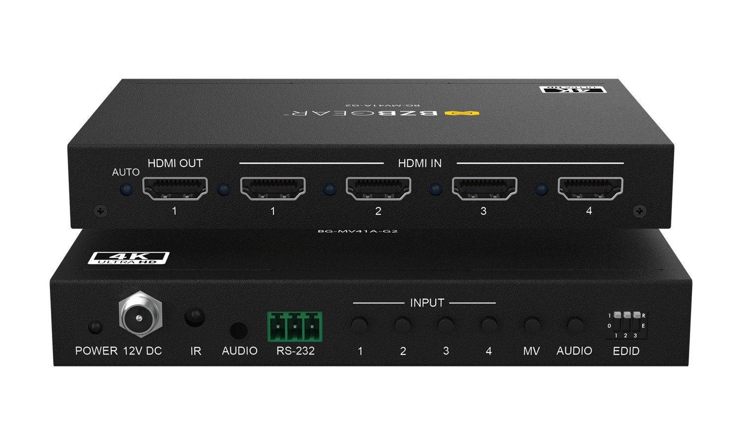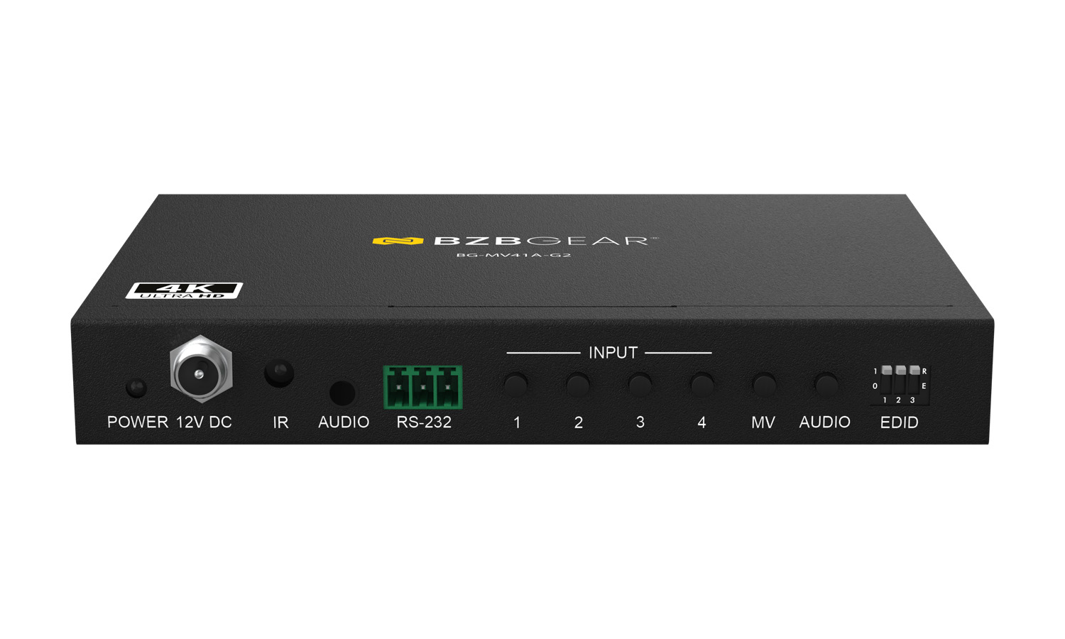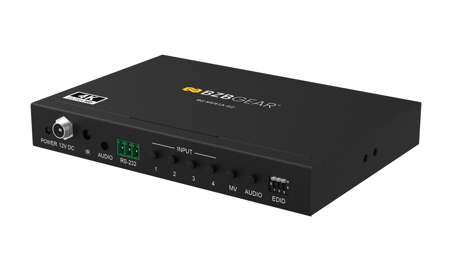 Audio can be independently selected and output through the analog port with support for LPCM, Dolby Digital, Dolby Digital Plus, and DTS. Featuring auto/manual input switching, smooth transitions between views, and an on-screen display (OSD), the BG-MV41A-G2 offers both performance and control flexibility. Management is simple via front panel buttons, IR remote, or RS-232 commands, while advanced EDID management ensures reliable compatibility – all in a compact form factor built for professional AV installations.