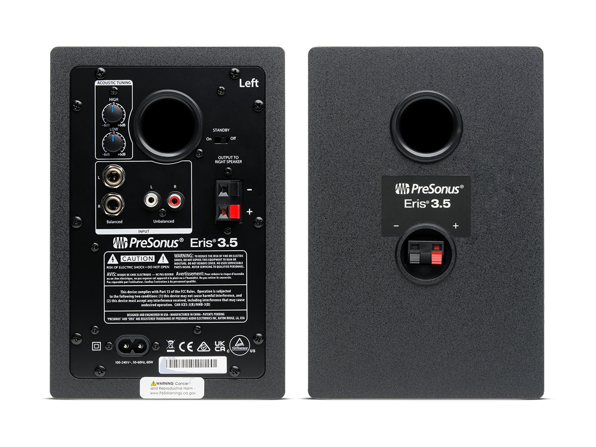 Connectivity covers a USB 2.0 interface for DAW integration, two balanced 1/4-inch main outputs for monitors, a dedicated 1/4-inch headphone output, and multiple monitor input options including stereo 1/8-inch and RCA. The interface’s low-noise design and switchable phantom power make it compatible with professional XLR condenser microphones and line-level sources. The monitors accept balanced TRS inputs for clean connection to the interface.