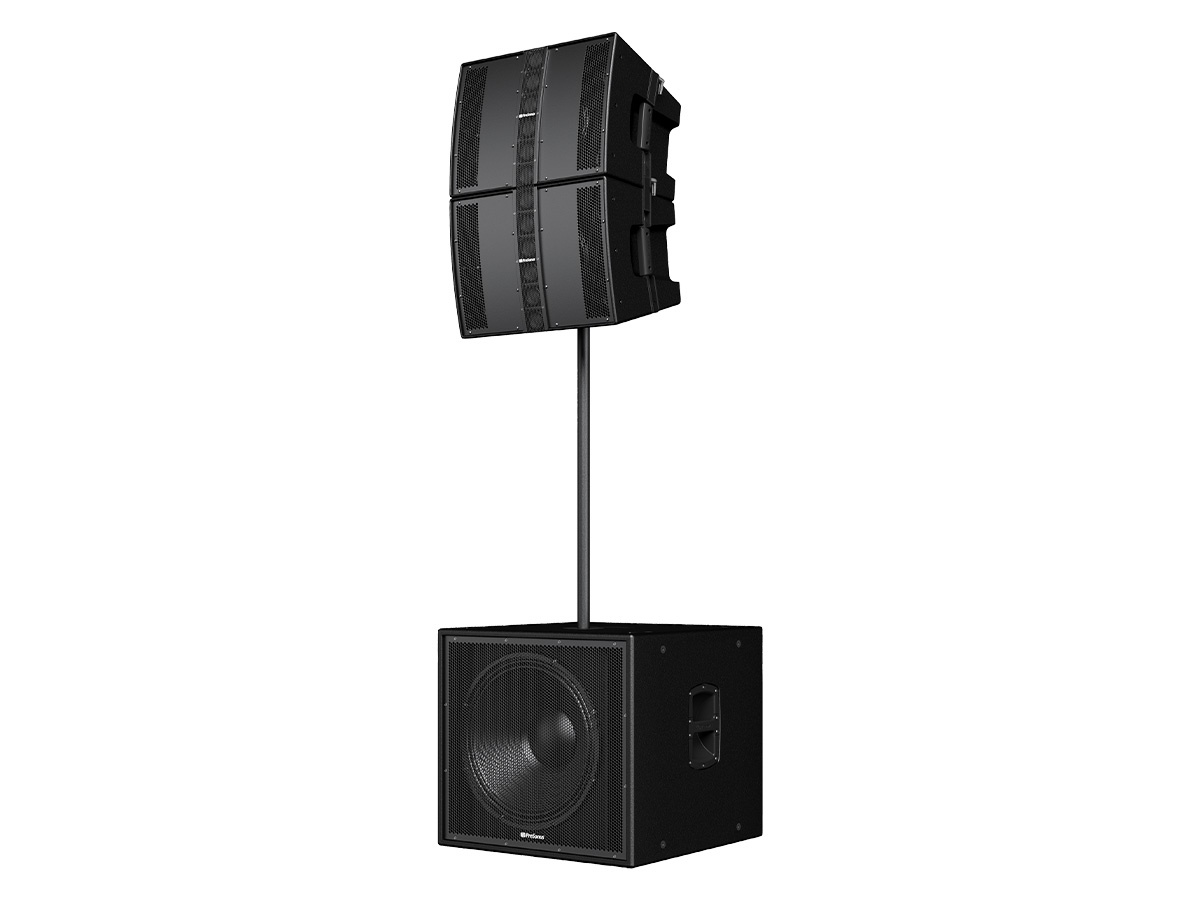 The subwoofer features an 18-inch LF transducer with a 4-inch voice coil and 7 mm of driver travel before over-excursion, enabling higher excursion without distortion. An integrated 2,000 watt peak (1000 watt RMS) Class D amplifier supplies the headroom required for clean transient response. A unique ported enclosure with four triangular corner ports improves efficiency while minimizing port noise and phase anomalies.