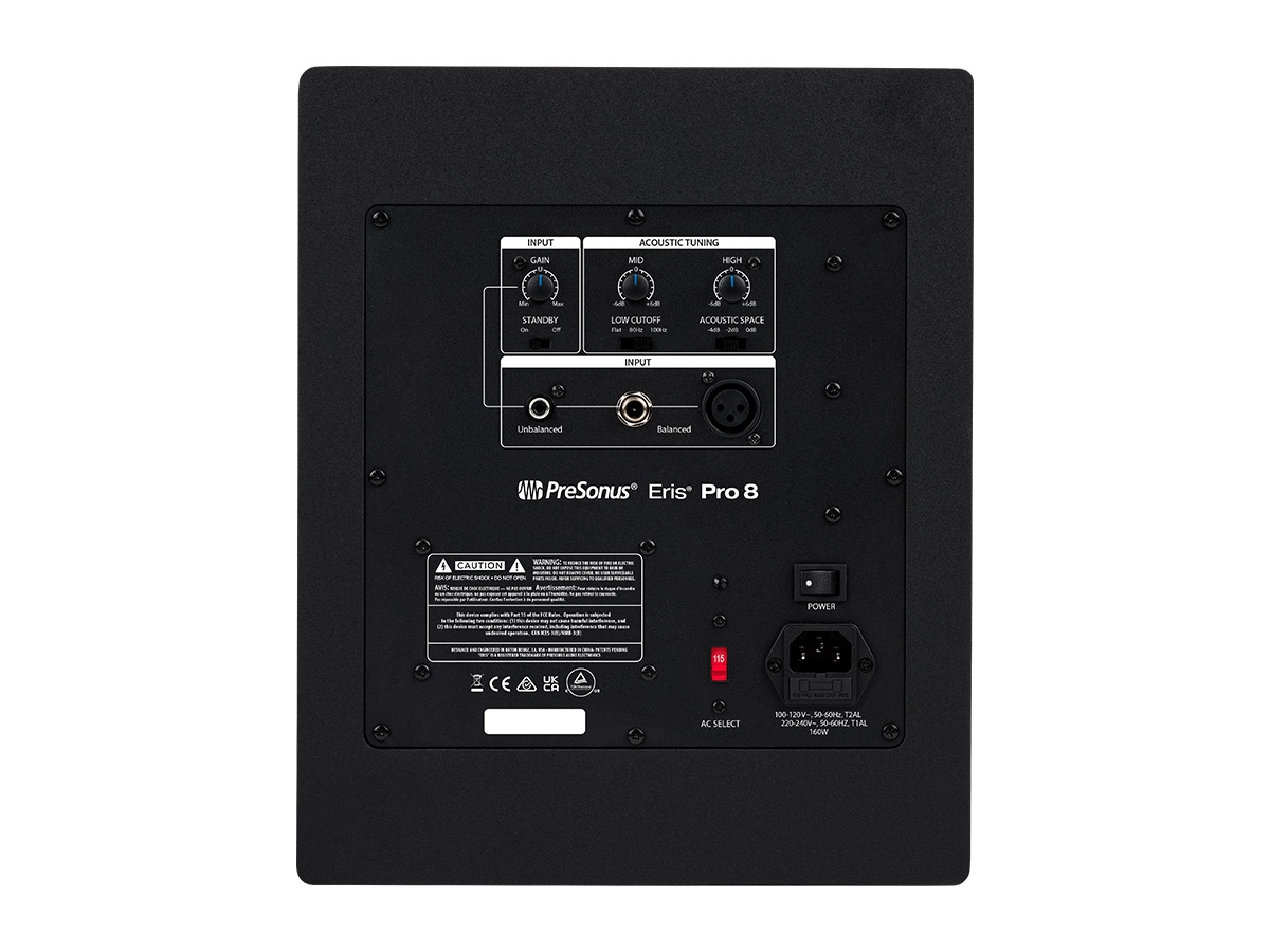 The cabinet is constructed from vinyl-laminated medium-density fiberboard and includes provisions for wall or ceiling mounting for flexible installation. An IEC power connection and universal 100-240 VAC input simplify deployment in varied facilities. Overall build quality and integrated protection features make the Eris Pro 8 dependable for daily studio use.