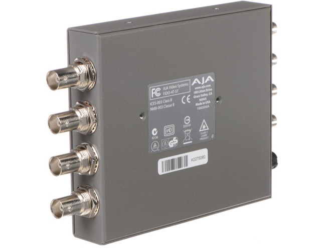 Connectivity includes four BNC 3G-SDI inputs and four ST single-mode fiber outputs, complying with SMPTE standards for SDI and fiber. The universal power supply is included for worldwide operation and the compact enclosure features a locking power connector for secure deployment. The device is compatible with standard SDI equipment used in studios, mobile trucks and field installations.