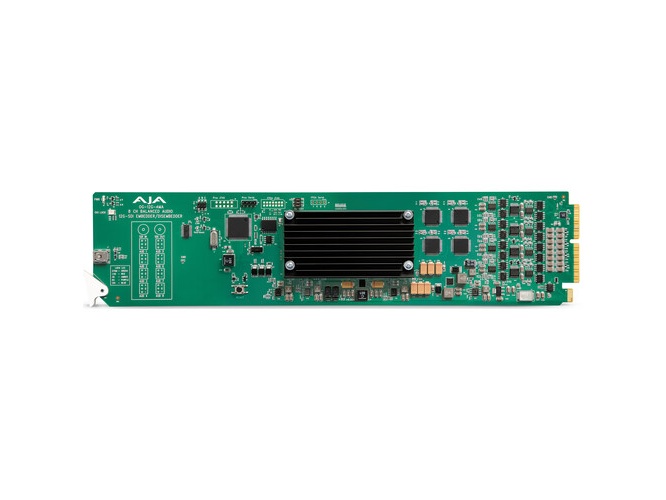 This card provides selectable analog audio levels and channel-pair embedding or disembedding to pass embedded audio or insert analog sources. Each of the four analog pairs can be configured as inputs or outputs via 3-pin terminal block connectors. The module supports balanced analog I/O and 24-bit A/D and D/A conversion for accurate audio integration.