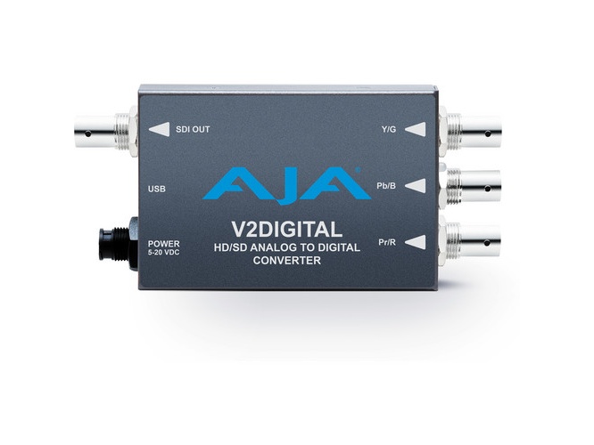The V2Digital is an analog to digital video mini-converter that converts component or composite analog signals to HD or SD SDI. It performs full 10-bit conversion and applies 2x oversampling to preserve image fidelity during conversion. The unit is compact and designed to integrate analog sources into SDI-based workflows without format scaling.