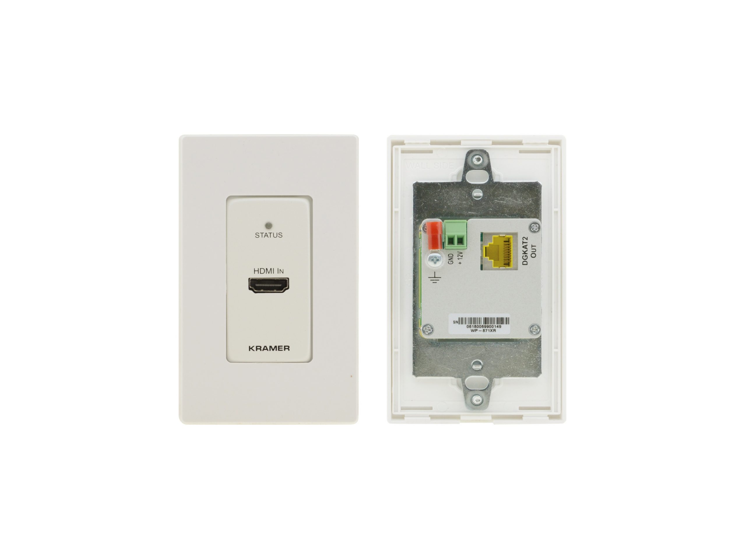 The WP-871xr is a compact 1-gang wall-plate transmitter that converts HDMI to DGKat 2.0 for long-reach distribution. It extends 4K@60Hz 4:4:4 HDR signals while preserving HDCP 2.2 compliance. The unit is powered over the same twisted pair cable using PoC – eliminating the need for a remote power source.