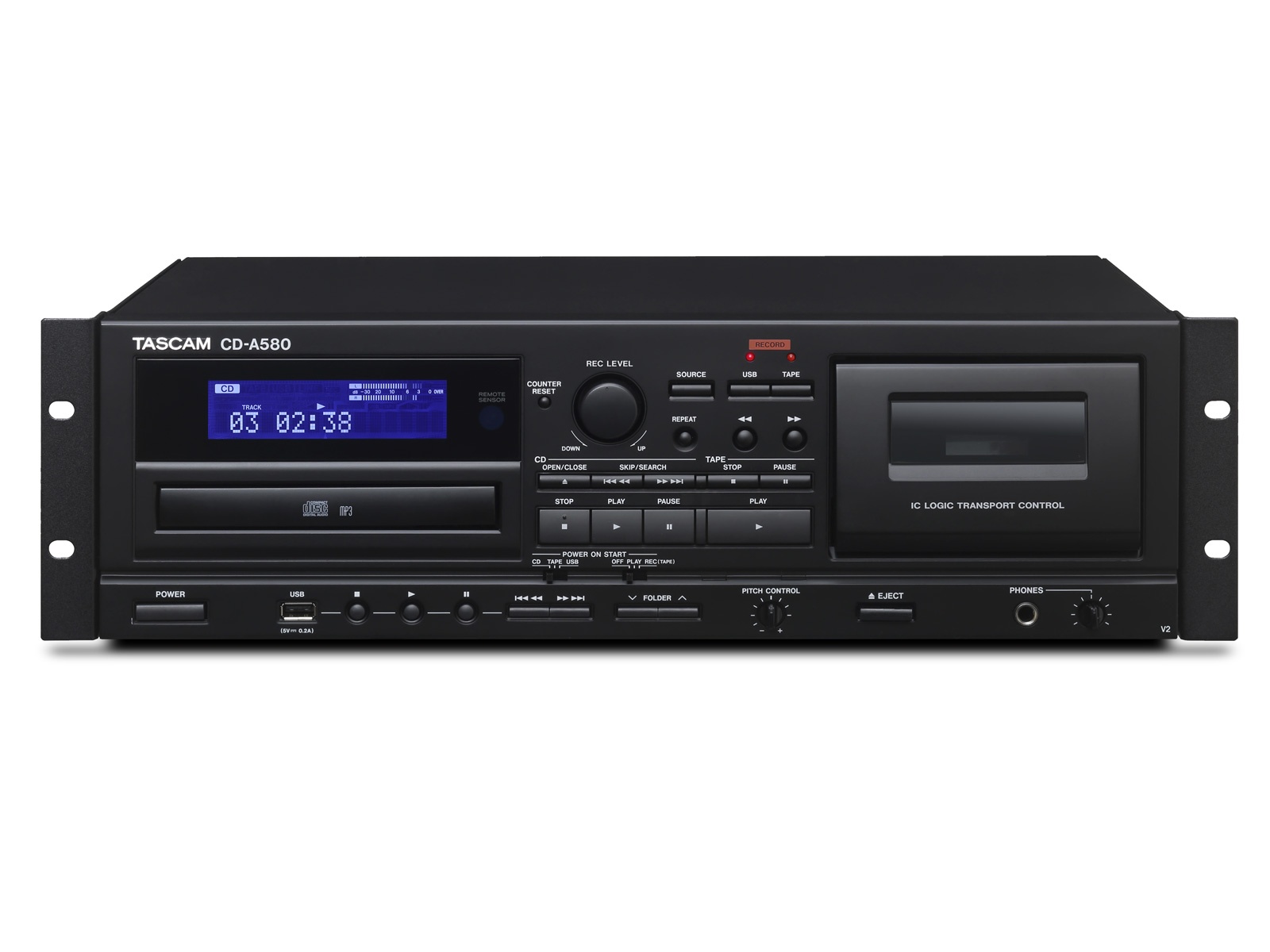 The CD-A580 V2 combines a CD player, cassette deck and USB MP3 recorder/player into a single 3U rack-mount chassis designed for dependable audio playback, recording and archiving. It supports standard audio CDs, CD-R/CD-RW data discs containing MP3 files, and cassette tapes from C-10 to C-90. The unit offers front-panel controls and an included wireless remote for convenient operation.