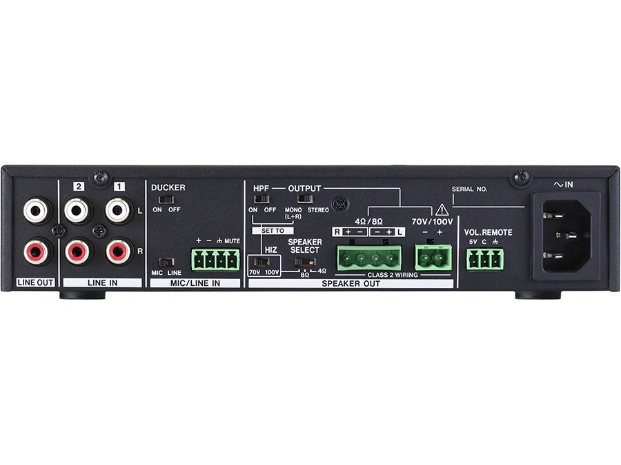 Connectivity includes a balanced combo front mic/line input plus a rear Euroblock balanced mic/line connector, two unbalanced RCA line inputs, and unbalanced RCA line outputs. Speaker connections are provided via Euroblock terminals for both low-impedance and high-impedance wiring. A 3-pin Euroblock remote connector allows external volume control integration.