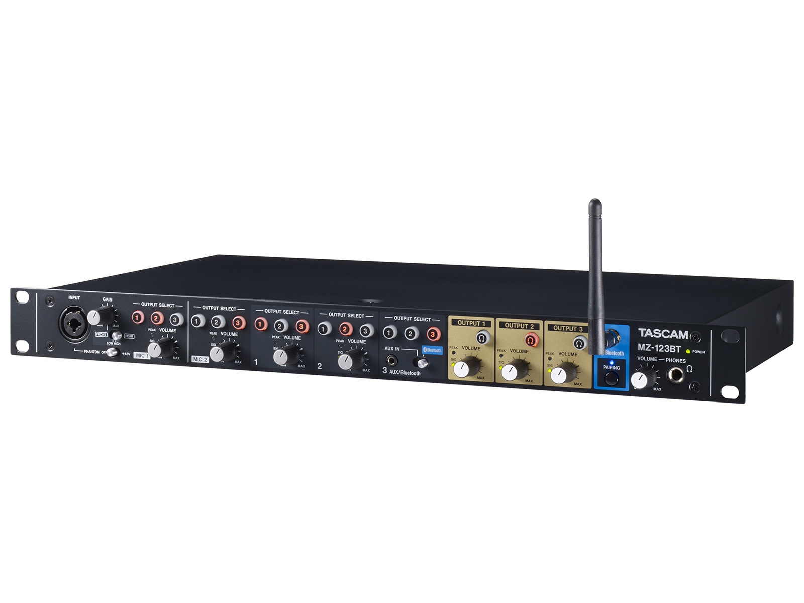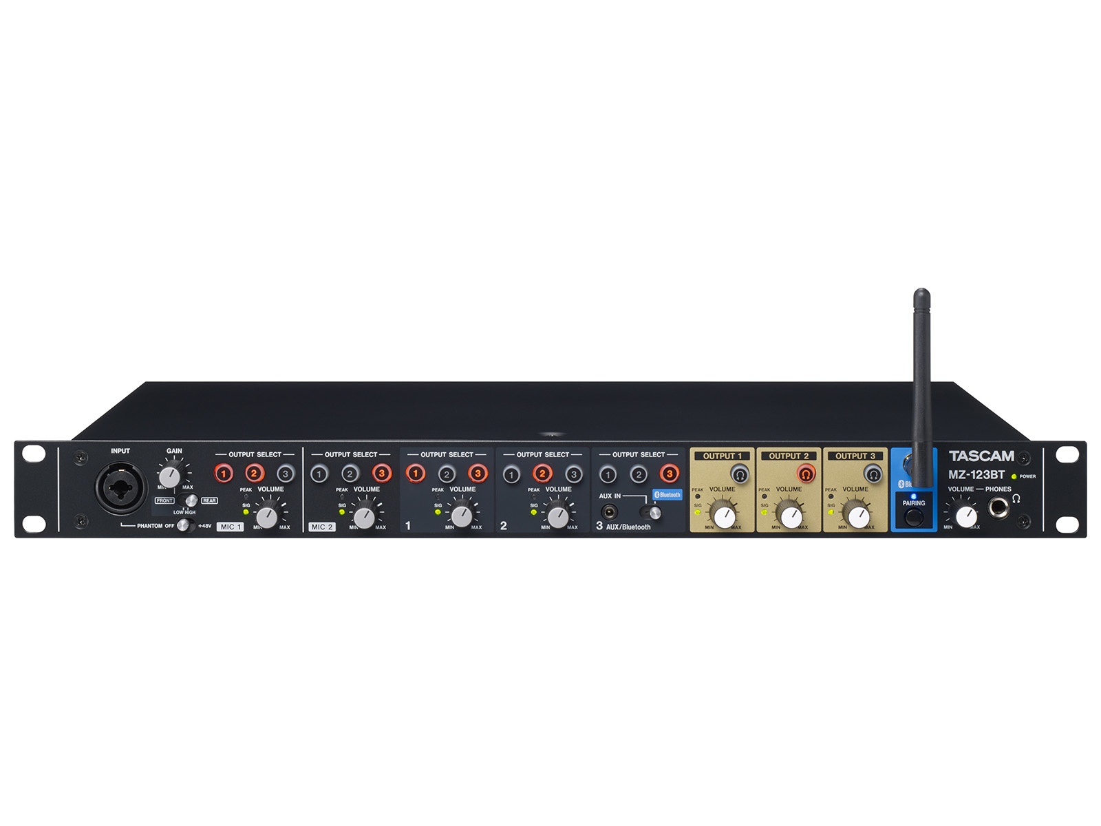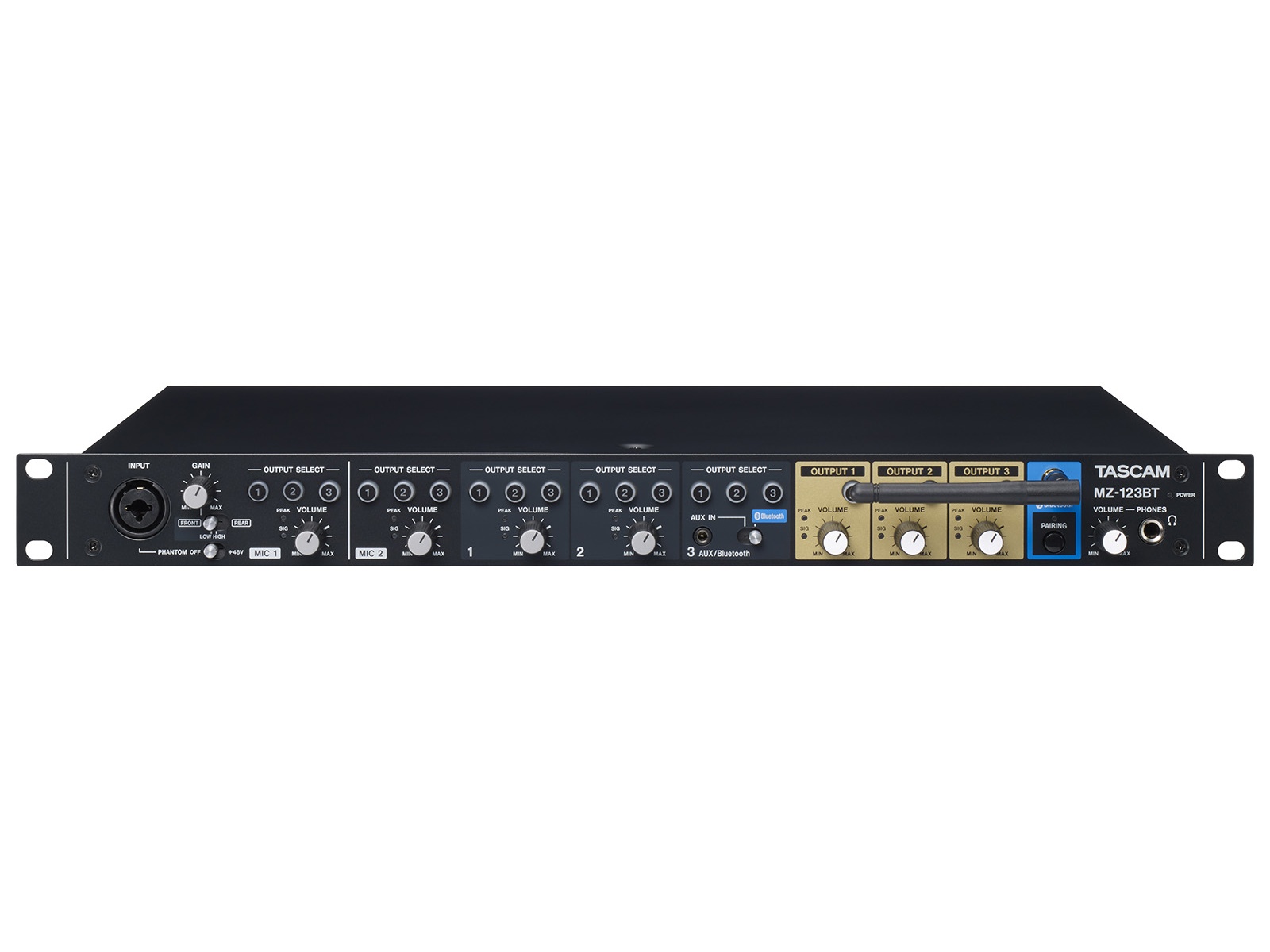 The MZ-123BT is a 1U rackmount multi-zone audio mixer designed to deliver independent background music and paging across three discrete zones. It combines music playback routing, announcement paging and local monitoring in a compact chassis suitable for commercial installations. The unit supports Bluetooth pairing for source playback and provides intuitive front-panel controls for daily operation.