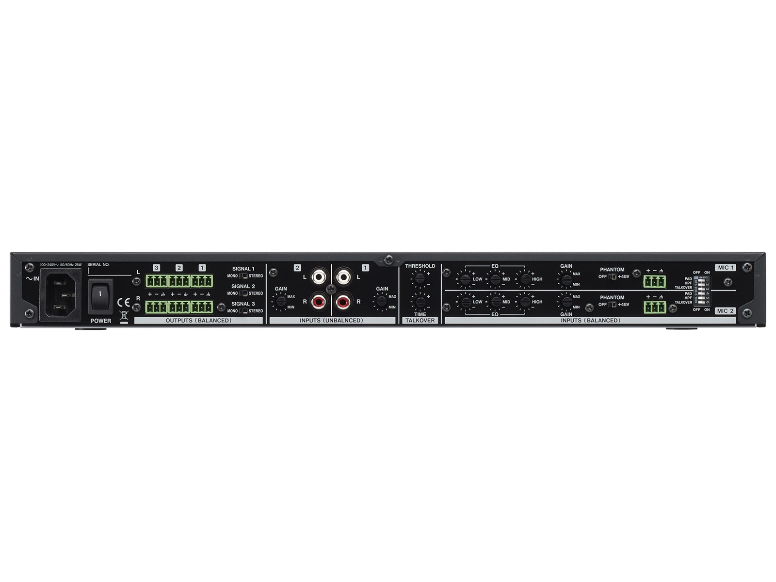 Three stereo input channels and three independent zone outputs enable selective routing of audio sources to any combination of zones. Two front mic inputs plus two rear Euroblock mic inputs support announcements and talk-over with automatic attenuation of background music during paging. Front-panel headphone monitoring and per-output volume controls simplify onsite monitoring and level adjustment.