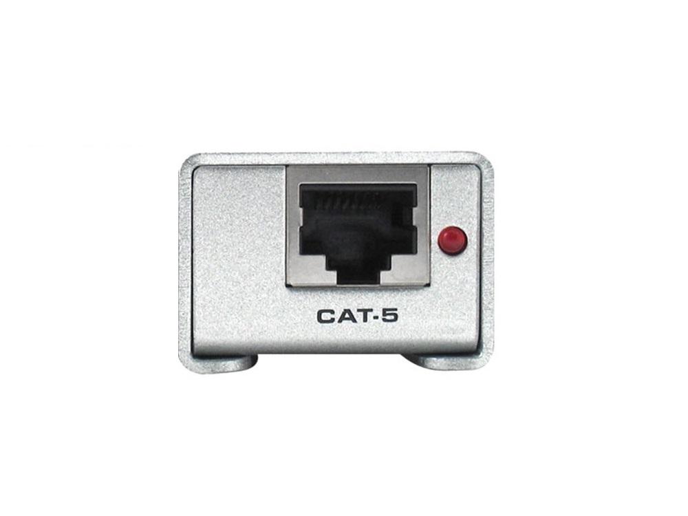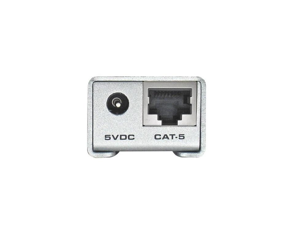 or audio output device. One CAT-5 cable connects the sender and the receiver to each