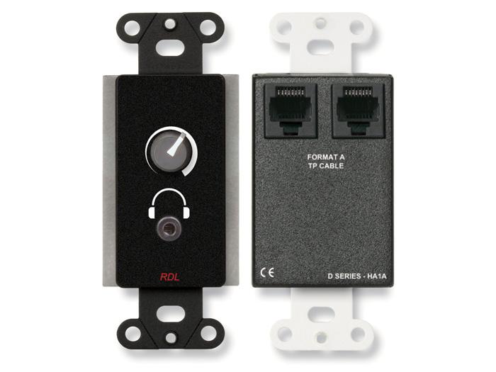 The D SERIES-HA1A is a two pair receiver and audio headphone amplifier compatible with RDL Format A twisted pair products. Each -HA1A receives stereo audio and 24 Vdc power through a rear-panel RJ45 jack fed from a Format-A sender. The left and right audio signals received on pairs B and C of the twisted pair cable are amplified and fed to the left and right channels of the output 3.5 mm Mini-jack.