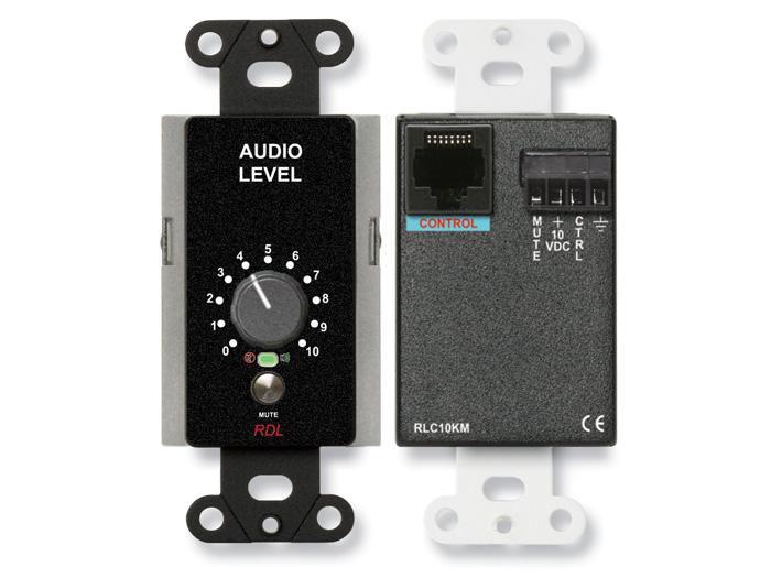 The DB-RLC10KM is the ideal companion to RDL VCA modules where levels are to be controlled from a single remote location and pushbutton muting is desired. It is designed to directly interface with the 3 wire control input of an RDL VCA module. A single shielded pair is normally used. The DB-RLC10KM contains a long life 10 kO potentiometer for setting the control voltage. The front panel has 10 graphic increments which provide a visual indication of the level setting. A MUTE button alternately mutes or un-mutes the audio in the associated RDL VCA product. An LED MUTE indicator glows red when the output is muted (0 volts dc), and turns green when the output is active (dc output voltage set by control). The DB-RLC10KM features a standard RDL white front panel. The RLC10KMS is offered in stainless steel with custom lettering available. These finishes match other RDL remote selectors and jack plates for a visually appealing installation of multiple controls.