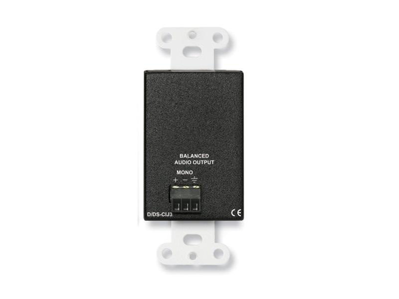 The D/S-CIJ3 is a complete unbalanced line-level audio input module. The front panel features two gold plated phono jacks and a single stereo mini-jack, intended for mono or stereo consumer level sources. An input signal may be connected to either the phono jacks or to the mini-jack. The left and right signal inputs are combined and balanced through audio transformers configured to reject induced hum. A mono line-level output is provided on the rear-panel detachable terminal block for connection to a 10 kO or higher input impedance line-level module or equipment input.