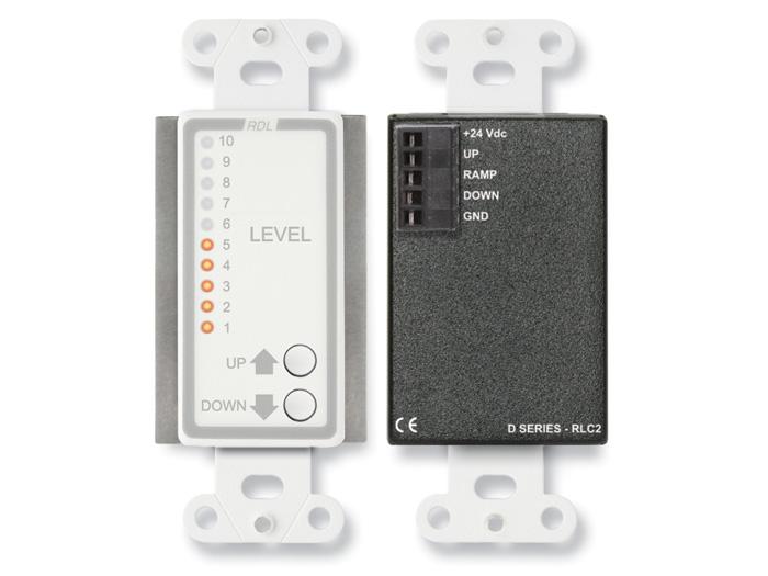 The D-RLC2 is designed to directly interface with RDL control modules, such as the STICK-ON® series ST-RG1 Ramp Generator, or RACK-UP® series RU-VCA2A Digitally Controlled Audio Attenuator. The D-RLC2 has two momentary pushbuttons, UP and DOWN. Pushing each button sends the appropriate signal back to the RDL control module. When connected to the RU-VCA2A, pushing both buttons on the D-RLC2 simultaneously causes the level to return to the PRESET level on the RU-VCA2A.