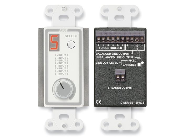 The D SERIES-SFRC8 Room Control Station is a SourceFlex listening station for wall mounting in a room, providing source selection and volume control from up to 8 audio sources. A numeric display shows the selected source. There are two line-level audio outputs on the rear of the unit, balanced and unbalanced, to feed an external power amplifier. The amplified power output can deliver up to 3.5 Watts RMS into an 8 ohm Speaker.