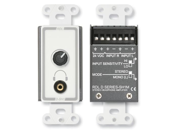 The DBSH1M is used in applications requiring headphones of any impedance to be driven from consumer or professional audio sources. It is ideally suited to applications as diverse as language translation, museums, interview studios and music stores. The -SH1 is a dual channel headphone amplifier with balanced/unbalanced left and right inputs. Each input accepts operating levels between -20 dBV and +20 dBu. Two recessed slide switches located on the side of the rear enclosure are set prior to mounting the module. One switch is provided for setting the input sensitivity. The mode switch selects between stereo and mono operation. In the mono position, the left input is used to drive both output channels. When the module is used in a monaural system, only the left channel input must be wired. The front panel level control is a long life potentiometer controlling matched VCAs. Audio does not pass through this control, assuring years of noise free level adjustment. The output amplifiers deliver more than 50 mW into either high or low impedance headphones. Module operation is from a 24 Vdc ground referenced power supply.