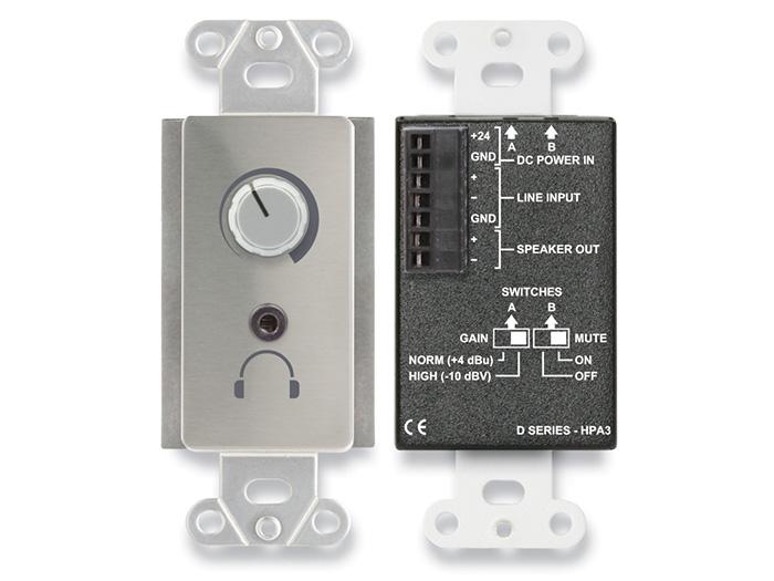The D SERIES-HPA3 is a high efficiency 3.5 W power amplifier with one line input, an amplified output to drive a 4 or 8 ohm speaker and a separate headphone amplifier. The -HPA3 features a balanced line level input that may be connected unbalanced. The gain range will accommodate standard unbalanced levels as well as professional balanced levels. The amplified output levels are controlled by a front-panel volume control.