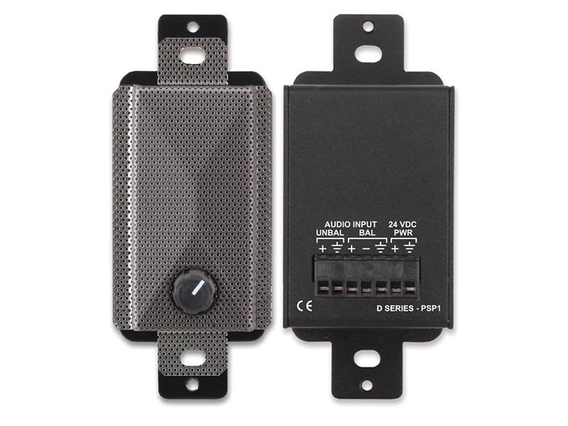 The D SERIES-PSP1 is a compact active loudspeaker that delivers rich, detailed sound in Decora-compatible wall or chassis mounts. The input accepts either a -10 dBV unbalanced or a +4 dBu balanced signal on the rear-panel detachable terminal block. Amplification is provided by a high-efficiency Class D power stage with audio filtering tailored for crisp, pleasant audio clarity. The high-efficiency Class D output stage produces negligible heat for all levels of expected voice or music modulation. The amplified output level is controlled by a front-panel volume control. The PSP1 includes an analog compressor/limiter that makes higher average sound output levels possible without clipping.