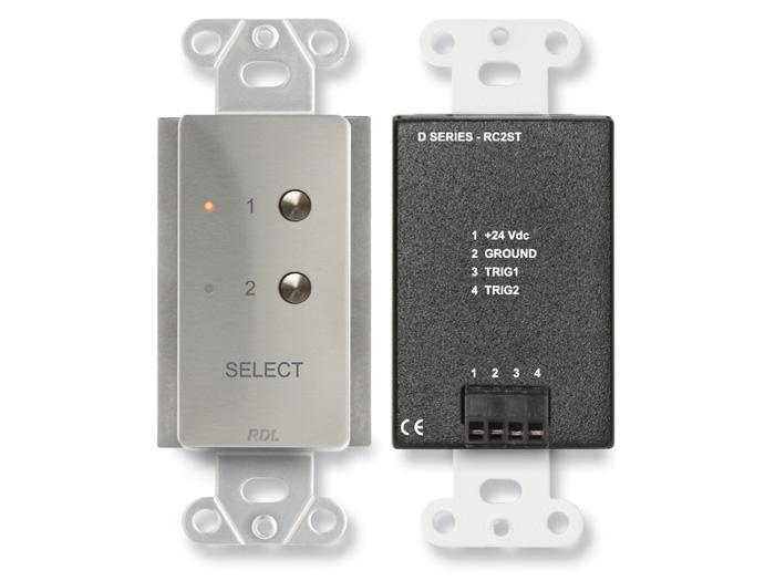 The front panel of the DS-RC2ST features two pushbuttons with two associated LEDs. Upon initial power-up, source 1 is selected. Touching the other button de-selects source 1 and immediately selects source 2. An LED adjacent to each button shows which source is selected.