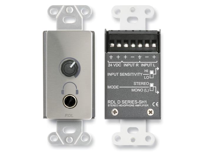 The DS-SH1 is used in applications requiring headphones of any impedance to be driven from consumer or professional audio sources. The DS-SH1 is ideally suited to applications as diverse as language translation, museums, interview studios and music stores. The module mounts conveniently in a precut opening in a wood or metal enclosure or in various RDL mounting accessories. The DS-SH1 is a dual channel headphone amplifier with balanced/unbalanced left and right inputs. Each input accepts operating levels between -20 dBV and +20 dBu. Two recessed slide switches located on the side of the rear enclosure are set prior to mounting the module. One switch is provided for setting the input sensitivity. The mode switch selects between stereo and mono operation. In the mono position, the left input is used to drive both output channels. When the module is used in a monaural system, only the left channel input must be wired. The front panel level control is a long life potentiometer controlling matched VCAs. Audio does not pass through this control, assuring years of noise free level adjustment. The output amplifiers deliver more than 50 mW into either high or low impedance headphones through a durable, metal ¼” (6.3 mm) standard headphone jack. Module operation is from a 24 Vdc ground referenced power supply. It can also operate from a 12 Vdc supply with a 6 dB reduction in headroom and a maximum output power of 10 mW.