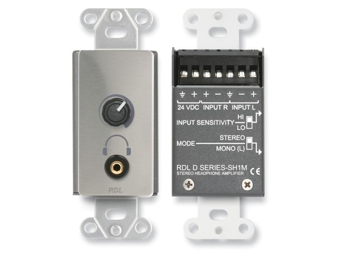 The DS-SH1M is used in applications requiring headphones of any impedance to be driven from consumer or professional audio sources. It is ideally suited to applications as diverse as language translation, museums, interview studios and music stores. The -SH1 is a dual channel headphone amplifier with balanced/unbalanced left and right inputs. Each input accepts operating levels between -20 dBV and +20 dBu. Two recessed slide switches located on the side of the rear enclosure are set prior to mounting the module. One switch is provided for setting the input sensitivity. The mode switch selects between stereo and mono operation. In the mono position, the left input is used to drive both output channels. When the module is used in a monaural system, only the left channel input must be wired. The front panel level control is a long life potentiometer controlling matched VCAs. Audio does not pass through this control, assuring years of noise free level adjustment. The output amplifiers deliver more than 50 mW into either high or low impedance headphones. Module operation is from a 24 Vdc ground referenced power supply.