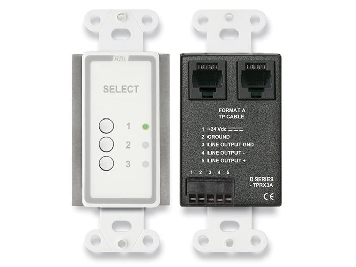 The D SERIES-TPRX3A is a three-pair audio receiving and switching module compatible with RDL Format-A twisted pair products. Three audio sources are available, corresponding to the three signal pairs A, B and C.