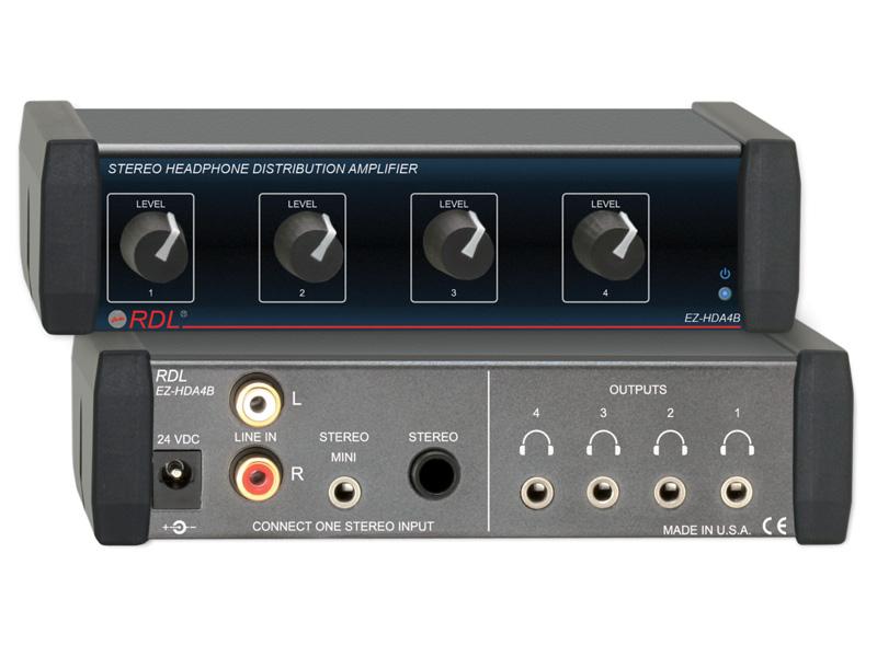 The EZ-HDA4B contains four stereo headphone amplifiers with individual front-panel volume controls. Headphone outputs are provided on rear-panel MINI jacks. One stereo input signal feeds all the amplifiers. Stereo RCA jacks, a MINI jack and a 1/4″ jack are provided for connecting the input source. The EZ-HDA4B is used in music stores, houses of worship, studios, museums, home component systems and commercial sound systems.