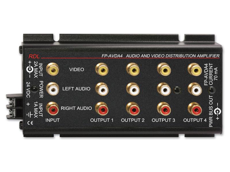 The FP-AVDA4 is the ideal choice in applications where consumer format audio and video signals need to be distributed simultaneously. Audio and video inputs and outputs are made on the top panel phono jacks. The FP-AVDA4 has a single 75 O input phono jack for the video signal and two phono jacks for the left and right audio inputs. Four source-terminated, 75 O video outputs are provided on the video output phono jacks. Four stereo audio outputs are provided on phono jack pairs located adjacent to the corresponding video output. Unused outputs need not be terminated. Audio and video outputs are at unity gain.