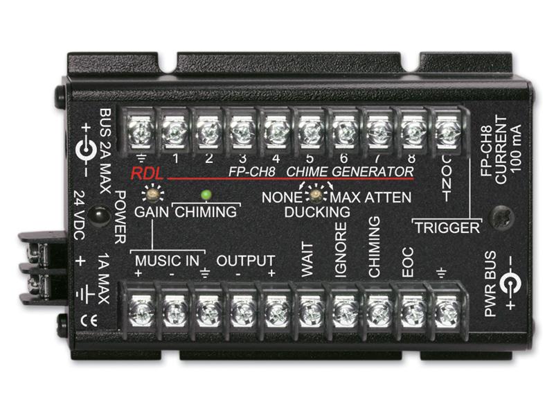 The FP-CH8 is an electronic chime generator that produces eight different synthesized chimes. Each chime can consist of up to 3 tones and 3 harmonics selected to produce sonically natural effects. Certain chimes are single tones and some are a sequence. Each of the 8 chimes is triggered by an individual external closure to ground. A momentary closure to ground is required to start a chime. A single additional CONT (continuous) terminal is also provided. Each chime plays once unless the CONT terminal is grounded. The continuous function causes a chime strike or sequence to repeat until the CONT terminal is ungrounded. This function causes tone chimes (Chimes 4 and 8) to be extended in duration until the CONT terminal is released. Background music or paging audio may be connected to the MUSIC INinput. When a chime plays, the music source will be quickly faded to a level set on the front-panel DUCKING trimmer. The ducking fade depth may be adjusted from 0 dB to fully off, allowing chimes to be mixed with the music or to interrupt the music. The front-panel CHIMING indicator illuminates while music is ducked and a chime is playing. WAIT and IGNORE terminals are provided to prevent or delay chiming action.