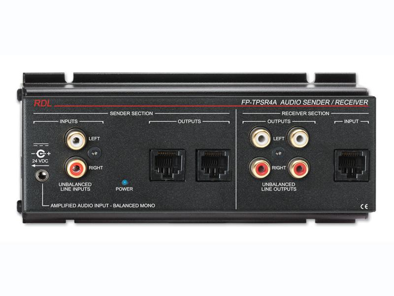 The Sender Section is an RDL Format-A audio sender that accepts either a stereo line-level or 1 to 3 Watt mono amplified fixed-level signal, usually from a commercial hospitality equipped TV. The FP-TPS4A distributes the source signal to two Format-A RJ45 output jacks to feed multiple Format-A receivers.