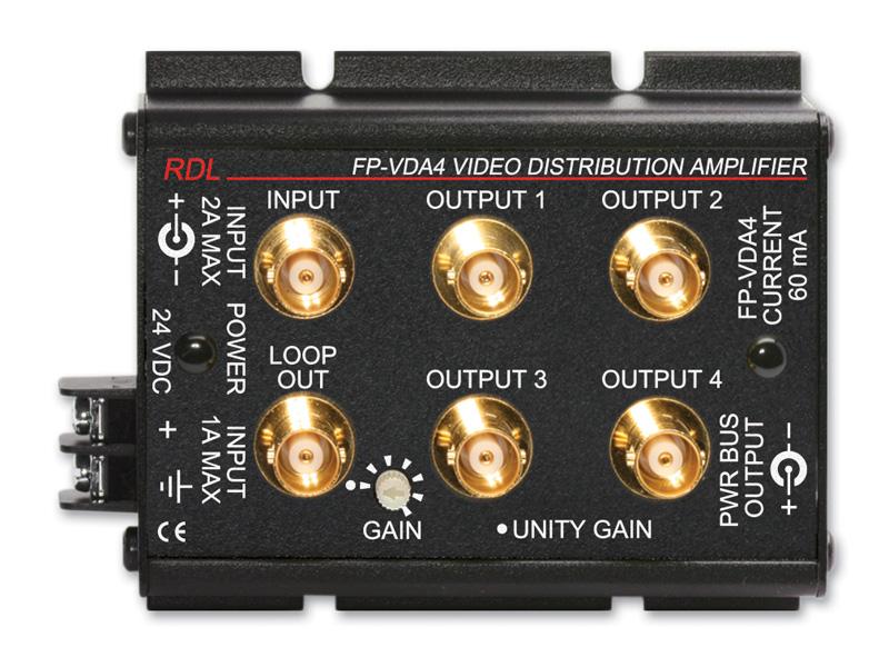 The FP-VDA4 is the ideal choice in many applications where video signals need to be distributed. Video input and output connections are made on the top-panel BNC jacks. Power connections are made using either the full-size barrier block terminals or a dc power jack located in one end panel. A second dc power jack is provided on the other end panel for connecting additional FLAT-PAK modules.