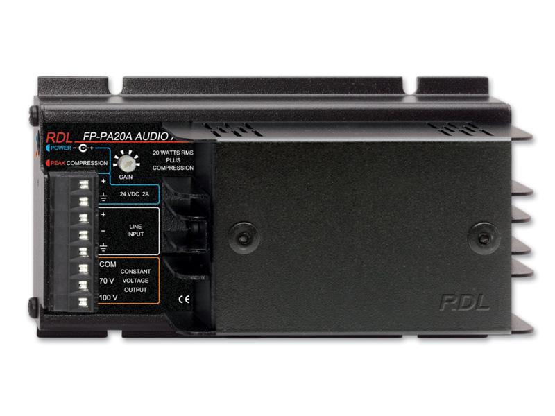The FP-PA20A features a balanced line level input that may be connected unbalanced. A front panel gain control is designed to be adjusted either manually or with a trimming screwdriver. The gain range will accommodate standard unbalanced levels as well as professional balanced levels. Both a 70 V and 100 V amplified output are provided to drive corresponding speakers in a distributed sound system. Audio levels that could cause the amplified output to clip are compressed using two dynamic time constants designed to preserve aural transparency. Normal audio level signals remain unaffected by the compressor thereby preserving audio dynamics and preventing the compressor from increasing feedback potential when the amplifier is used for paging. The FP-PA20A produces average audio levels and audio clarity normally expected of amplifiers delivering much higher output power.