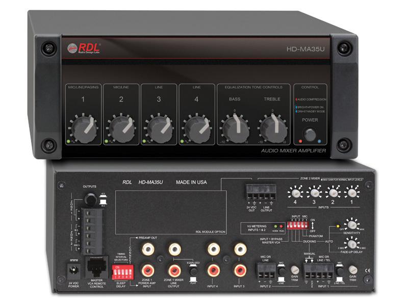 The HD-MA35U is a four input audio mixer amplifier for systems demanding the broadest range of features and the highest energy efficiency. Two output power amplifier zones, 35 watts (Zone 1) and 4 watts (Zone 2), are driven from high-efficiency Class D amplifier stages. The mixer and amplifier sections all normally shut down (standby “sleep” mode) when audio is absent and automatically turn on when needed. The Zone 1 amplifier output level may be VCA controlled using various optional RDL remote controls, or by industry standard 0 to 10 Vdc or 0 to 10k ohm controls. This output drives 4 ohm or 8 ohm speakers. The output impedance is switch-selectable on the rear panel. The Zone 2 amplifier output drives an 8 ohm speaker and/or 600 ohm telephone equipment.