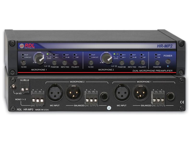 The HR-MP2 is a dual channel microphone preamplifier with line-level outputs. Each section provides identical rear-panel signal connections and front-panel controls.